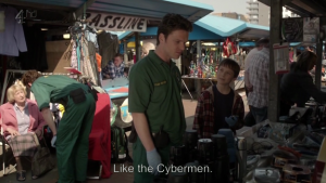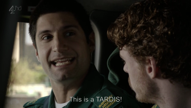 另外,第一季短短六集,其中有两次引用到Doctor Who的梗,特此记录。第一次是Rachid的第一次开救护车,车速开得超快,完全达到了官方要求的响应时间。短是短,但是把同行的两位都给弄晕了。Rachid问:“Did we hit the target?”Stuart回:“Hit the target? We got here before we even left.”Rachid得意的说:“Yes. Success! This is what I’m talking about. This is a TARDIS!”然后开始学起Doctor Who主题音乐。第二次是Stuart发觉从小抛弃他的爸爸后来重新组建家庭生了一个儿子也叫Stuart,于是他不禁疑问:“What if he was trying to create an army of clones? Like the Cybermen.”